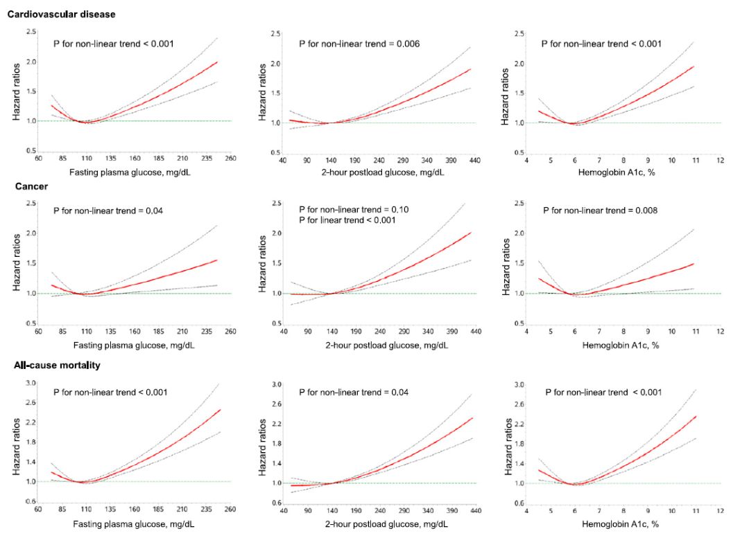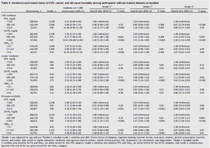以FPG 126 mg/dL、2h-PG 200 mg/dL、HbA1c 6.5% (48 mmol / mol)的未经治疗的糖尿病患者数据为基础,患者所对应的心血管病风险比为1.18、1.31和1.20;癌症风险分别为1.10、1.44和1.08;全因死亡率风险比为1.37、1.57和1.33 (表2)。