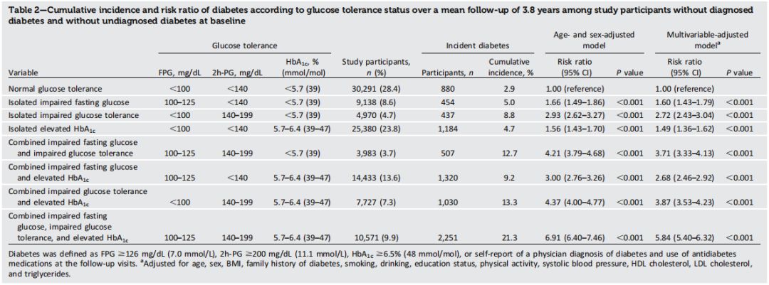 1. 2h- PG最能反映糖尿病发病风险,且FPG、2h- PG和HbA1c三个指标异常个体的糖尿病发病率最高