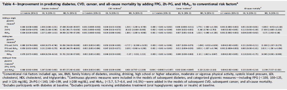 表3 在传统危险因素中添加FPG、2h-PG和HbA1c可提高糖尿病发生、CVD、癌症和全因死亡率的预测效果