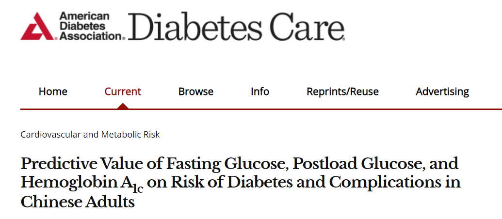 1. Jieli Lu,et al. Predictive Value of Fasting Glucose, Postload Glucose, and Hemoglobin A1c on Risk of Diabetes and Complications in Chinese Adults,Diabetes Care,2019,42:1539-1548